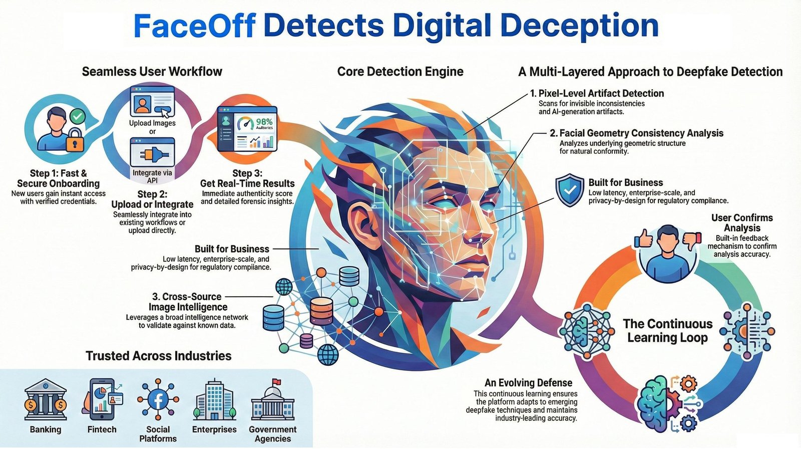 Unlock InsightsFaceOff provides an AI-powered deepfake image detection platform that accurately identifies manipulated or AI-generated facial images using advanced computer vision and forensic intelligence. Built for low latency, enterprise scale, and privacy-by-design, it helps banks, enterprises, platforms, and governments prevent identity fraud, impersonation, and digital misinformation.